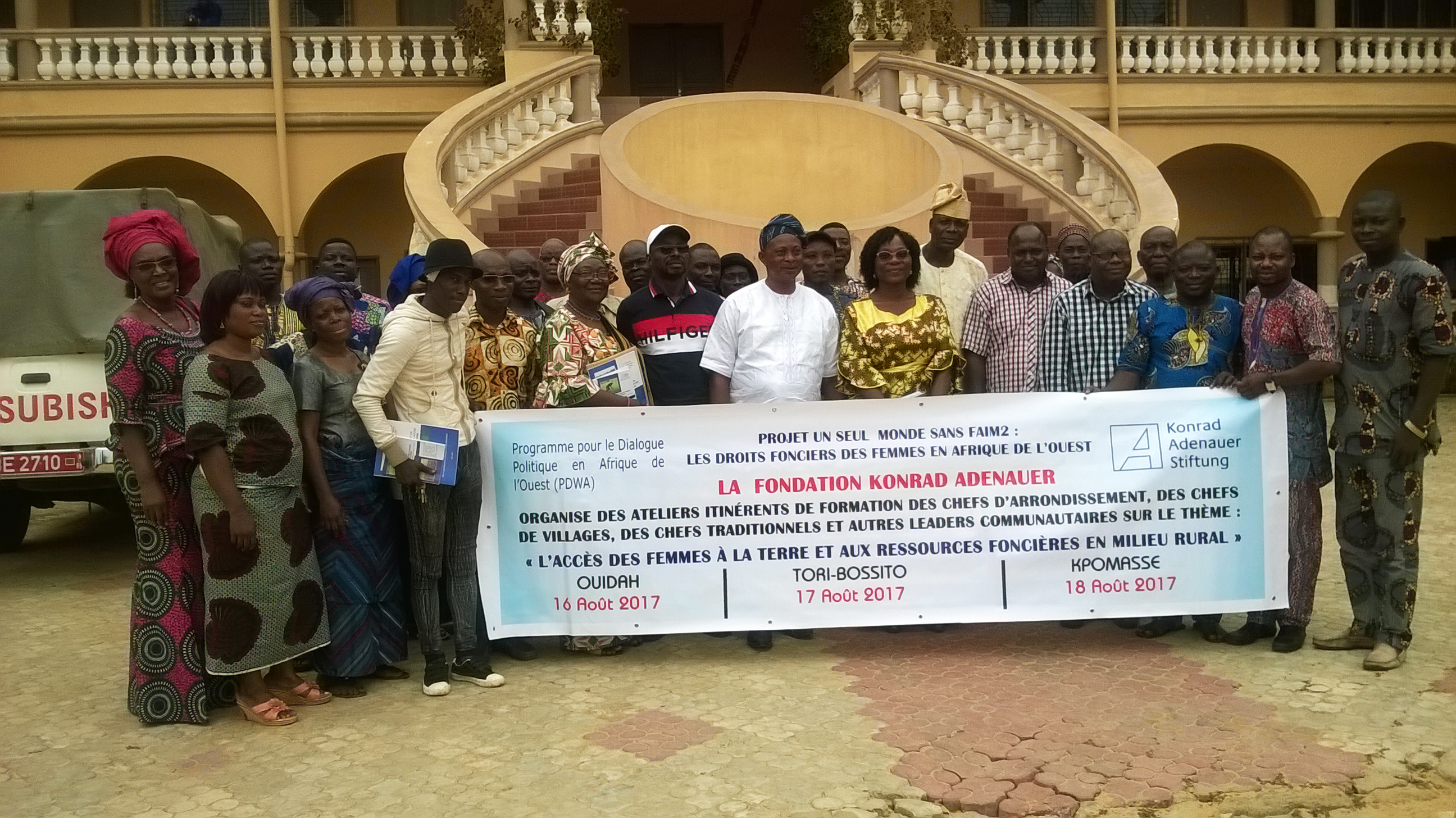 En collaboration avec l’Ong Synergie paysanne (Synpa), la Fondation Konrad Adenauer a organisé les 16, 17 et 18 Août 2017 des ateliers de formation itinérante à l’intention des Chefs d’Arrondissement, village, traditionnels et autres leaders communautaires sur les Droits fonciers des femmes dans les communes de Tori-Bossito, Ouidah et Kpomassè. Objectif : Informer, sensibiliser, conscientiser et vulgariser les droits des femmes sur la propriété foncière et les textes et lois contenus dans le nouveau code foncier et domanial afin de réaliser le projet Allemand, «Un seul monde sans faim » lancé dans l’espace Cedeao.