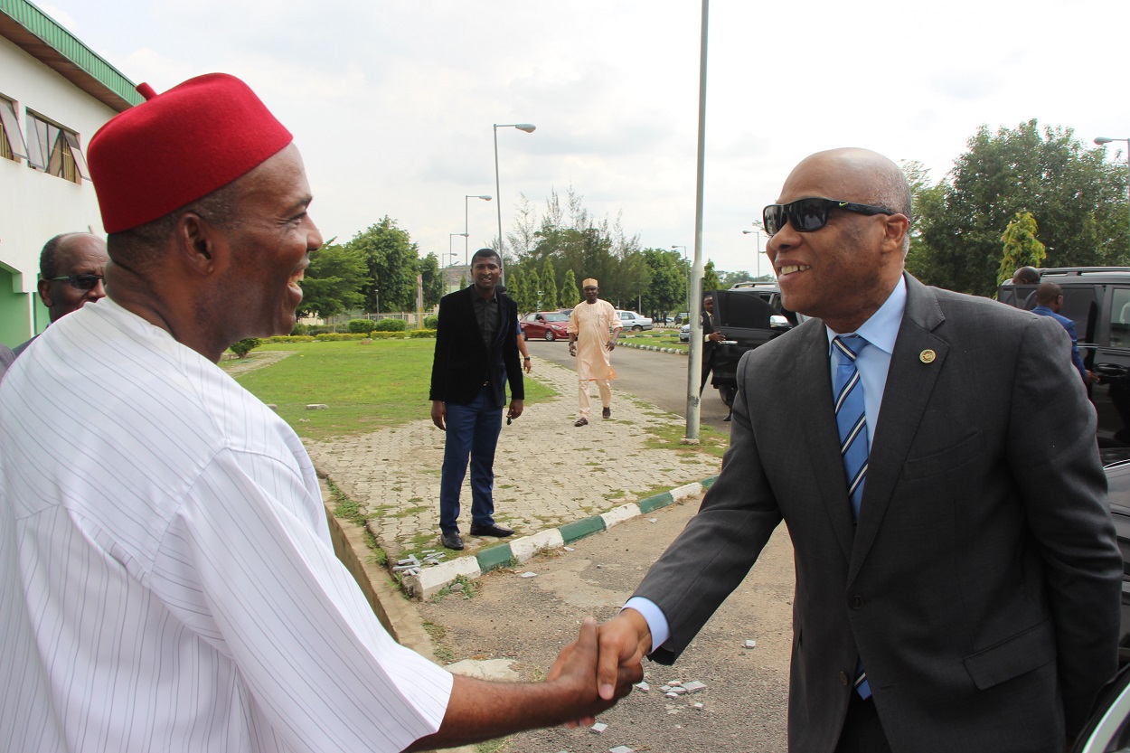 Ph:DR-: Jean-Claude Kassi Brou, President of the ECOWAS Commission ( r)  being received by Hon. Minister of Science and Technology of Nigeria, Dr.  Ogbonanya Onu on arrival at the NASRDA Headquarters.