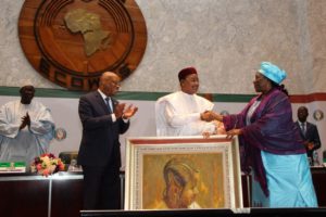 Gift being handed to Chair Issoufou by President Brou and VP Koroma
